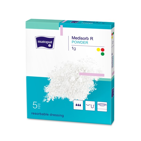 MEDISORB R POWDER besirezorbuojantis tvarstis-milteliai lėtinėms žaizdoms, sterilūs 1g, 5 vnt.