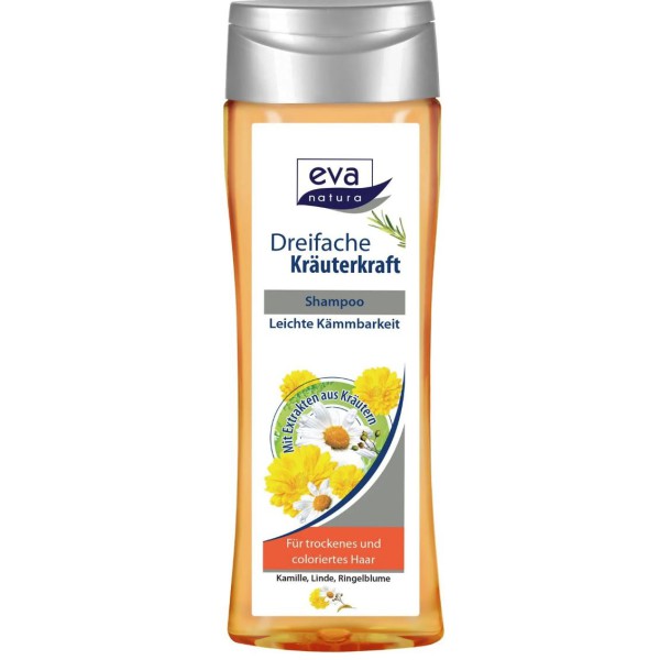 "Eva Natura" šampūnas su ramunėlėmis, liepomis ir medetkomis, provitamino B5 ir vitaminuo PP hidrokompleksu, kuris palaiko odos ir plaukų atsparumą, funkcijas.