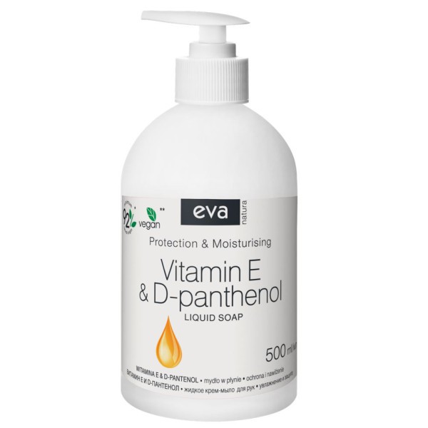 "Eva Natura" kreminis skystas muilas su vitaminu E ir D-pantenoliu švelniai valo, prižiūri ir apsaugo rankas nuo žalingo išorės veiksnių poveikio. Tinka visų tipų odai, taip pat ir jautriai odai. Sudėtyje yra 92 % natūralios kilmės ingredientų. Sudėtyje esantis vitaminas E maitina, atstato ir drėkina; D-pantenolis ramina, suteikia odai glotnumą. Patogi pakuotė su dozatorium. Dermatologų patikrinta.