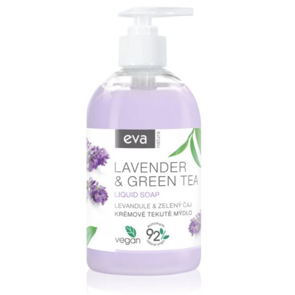 "Eva Natura" kreminis skystas muilas su levandų ir žaliosios arbatos ekstraktais švelniai valo, kondicionuoja, drėkina rankų odą. Tinka visų tipų odai, taip pat ir jautriai odai. Sudėtyje yra 92 % natūralios kilmės ingredientų. Patogi pakuotė su dozatorium. Dermatologų patikrinta.