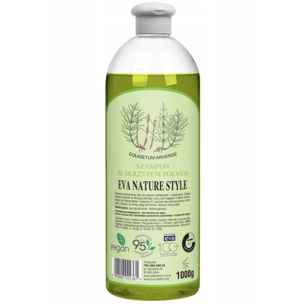 "Eva Nature Style'" šampūnas su arkliarūgšte skirtas kasdienei plonų ir silpnų plaukų priežiūrai. Jo sudėtyje yra natūralaus lauko arkliarūgštės ekstrakto, kuris yra turtingas silicio, kalio, flavonoidų ir vitamino C šaltinis, svarbių plaukų ir galvos odos sveikatai. Puikiai putoja, pasižymi normalizuojančiu, nuo pleiskanų apsaugančiu poveikiu. Sudėtyje yra 95 % natūralios kilmės ingredientų. Reguliariai naudojant šampūną plaukai bus stiprūs, sveiki ir blizgantys. Dermatologų patikrinta. Tinka ir jautriai odai. Kaip naudoti: nedidelį kiekį šampūno užpilkite ant sudrėkintų plaukų, paskirstykite, po to nuplaukite švariu tekančiu vandeniu.