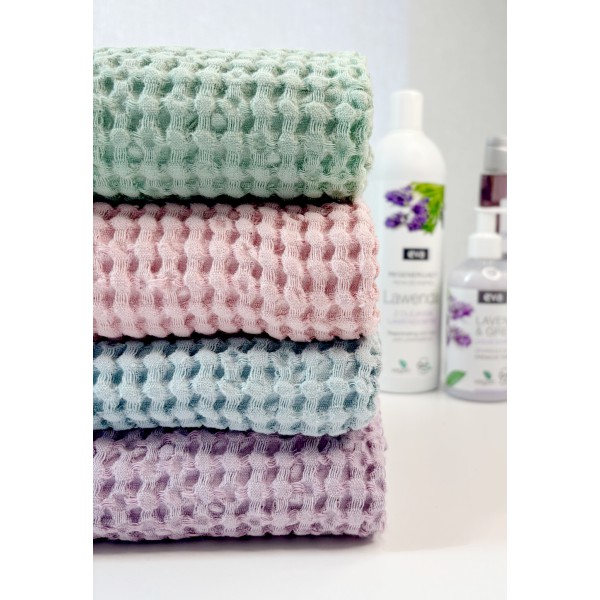 Minkštinto, 50% lino, 50% medvilnės vaflinės struktūros rankšluostis puikiai tinka voniai, saunai, paplūdimiui. Greitai džiūsta.
