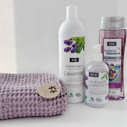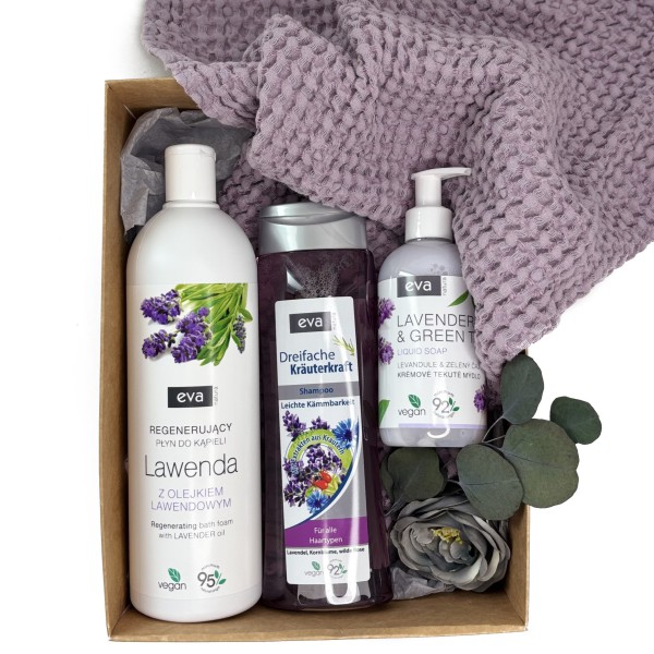 EVA kūno ir plaukų priežiūros rinkinys "Lavender" su lininiu rankšluosčiu 100x150cm