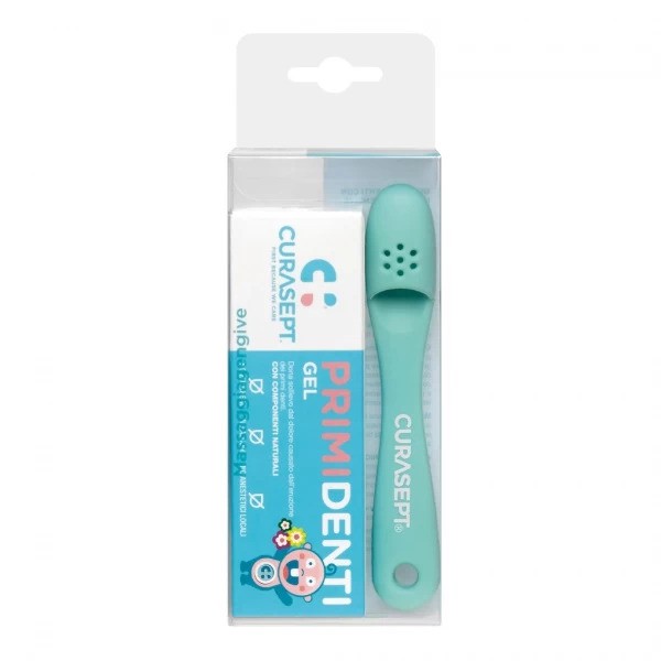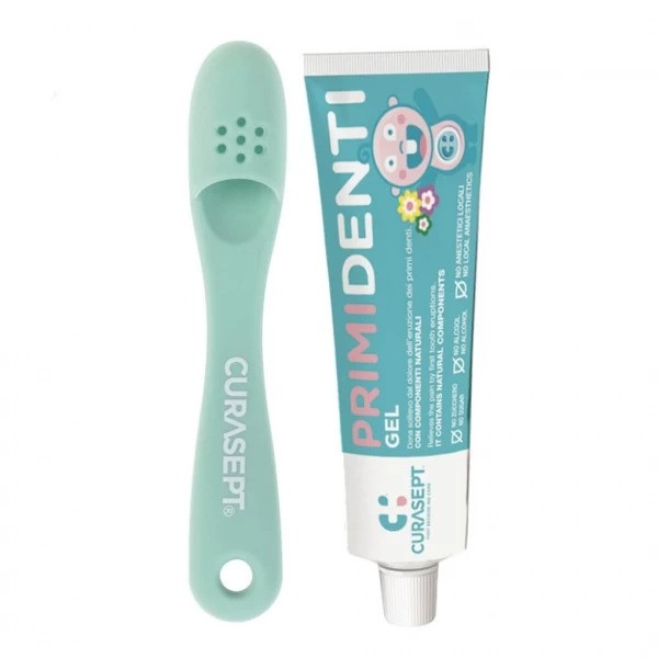Rinkinys skirtas pirmojo dantų dygimo metu suteikti greitą pagalbą kūdikiui. Rinkinį sudaro 20 ml. "Primi Denti" gelis ir 1 vnt. Curasept masažuojamasis dantenų šepetėlis.